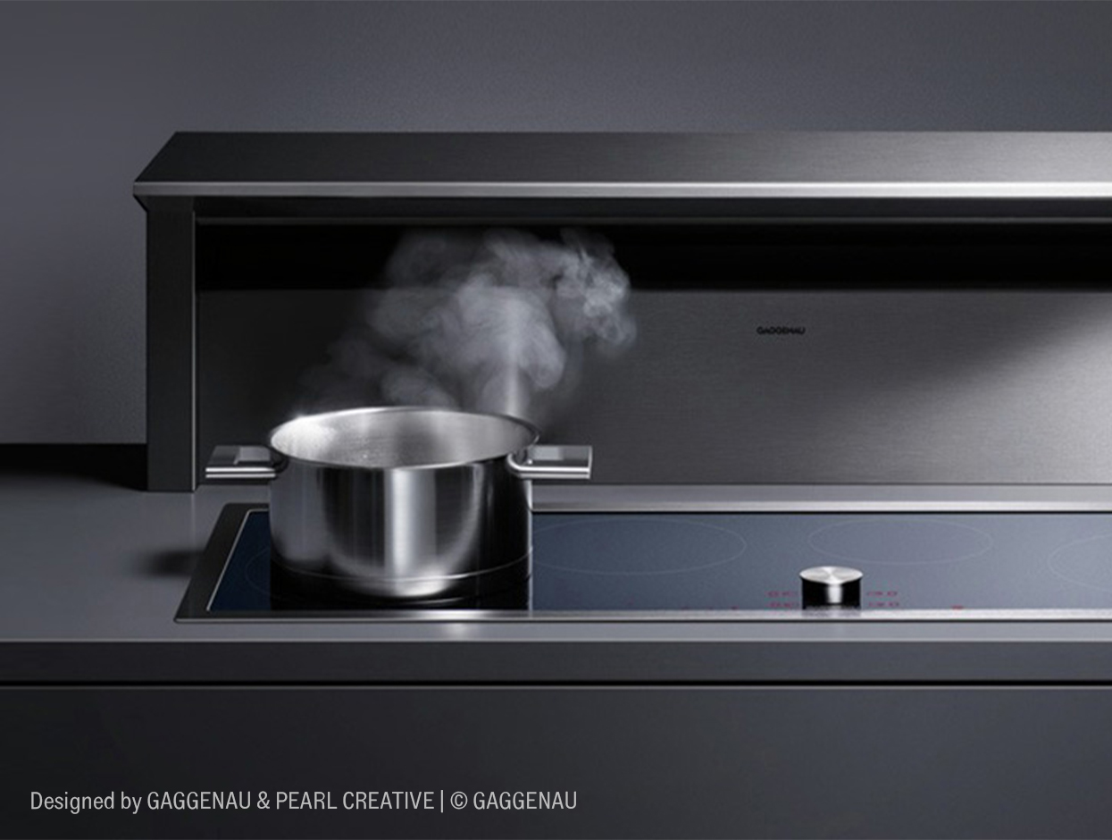 Die Gaggenau AT 400 Tischabsaugung bietet eine hocheffiziente Lösung für das Kochen ohne störende Gerüche. Mit Umlufttechnik erfasst das System Wrasen effizient direkt an der Quelle und reinigt die Luft in mehreren Filterstufen. Das minimalistische, architektonische Design - von Pearl Creative und Gaggenau Inhouse Design - vereint Abluftreinigung, Beleuchtung und zusätzliche Arbeitsfläche in einem multifunktionalen Produkt, das den höchsten ästhetischen Ansprüchen gerecht wird – eine echte Design-Ikone.