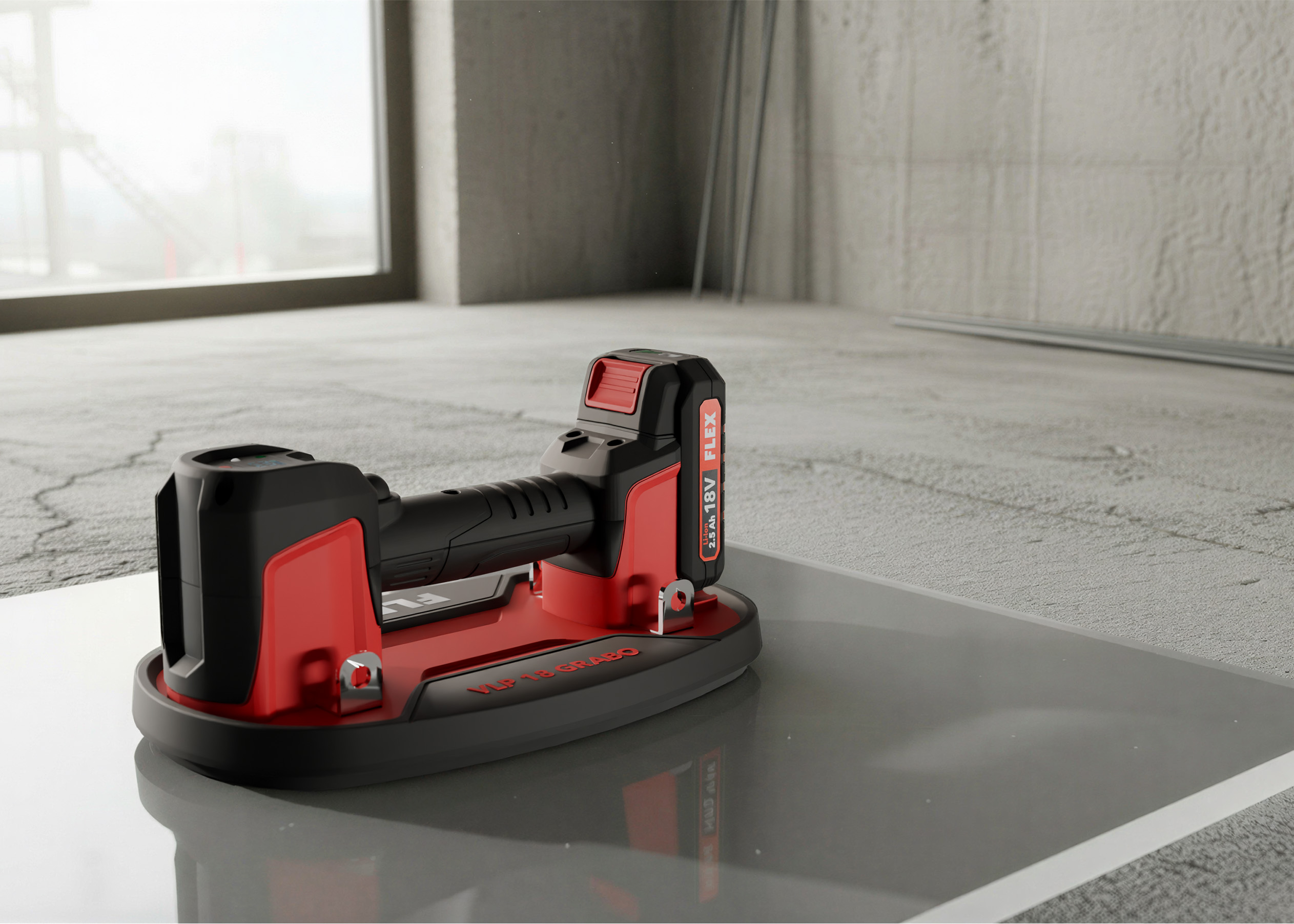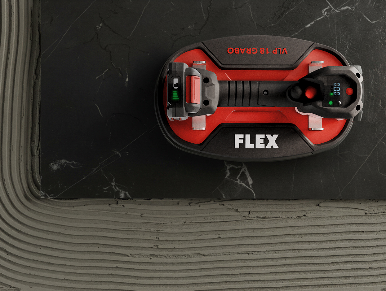 Der VLP 18 Grabo Akku-Vakuumheber wurde in enger Zusammenarbeit zwischen FLEX und STUDIO STORTI entwickelt und kombiniert funktionale Exzellenz mit der typischen Flex-Designsprache. Mit einer maximalen Haltekraft von 170 kg und einer digitalen Gewichtsanzeige ermöglicht er das sichere, ergonomische und mühelose Heben und Versetzen verschiedenster Baustoffe wie Platten, Steinfliesen, Holz, Glas und Metall. Das Gerät ist speziell für den harten B2B-Einsatz konzipiert und überzeugt sowohl funktional als auch optisch.